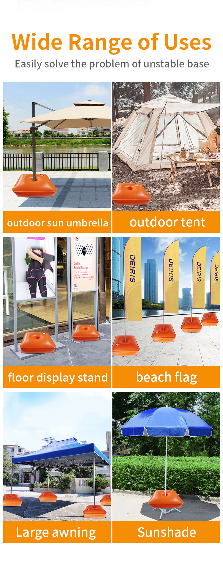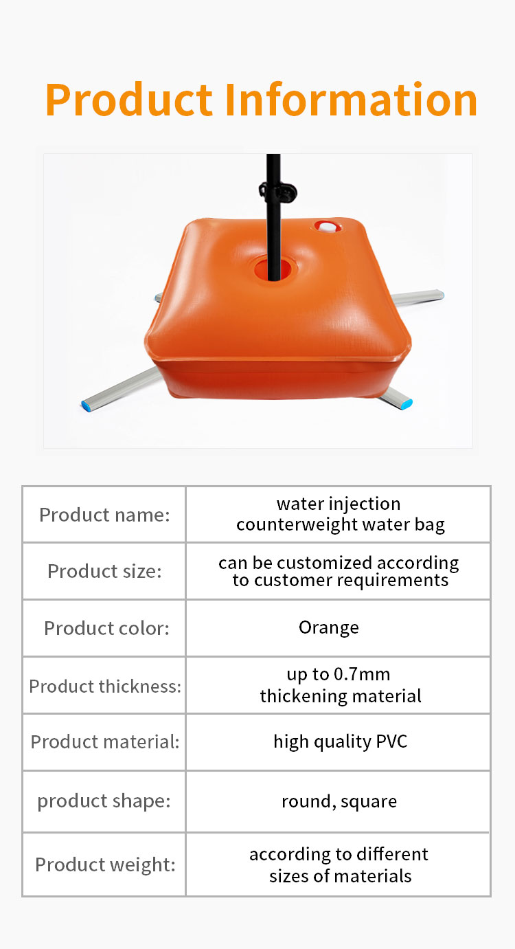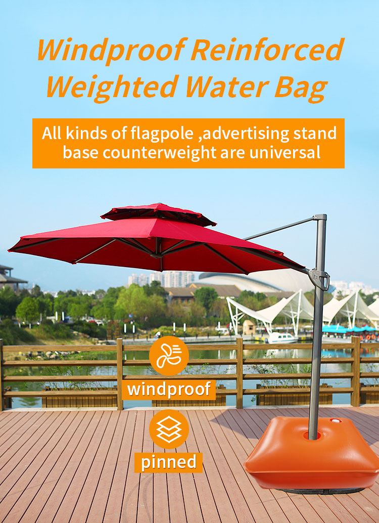 3. Water Filling: The small umbrella bottom water weight bag can fill up to 10kg-15kg. The large umbrella bottom water weight bag can fill up to 30.